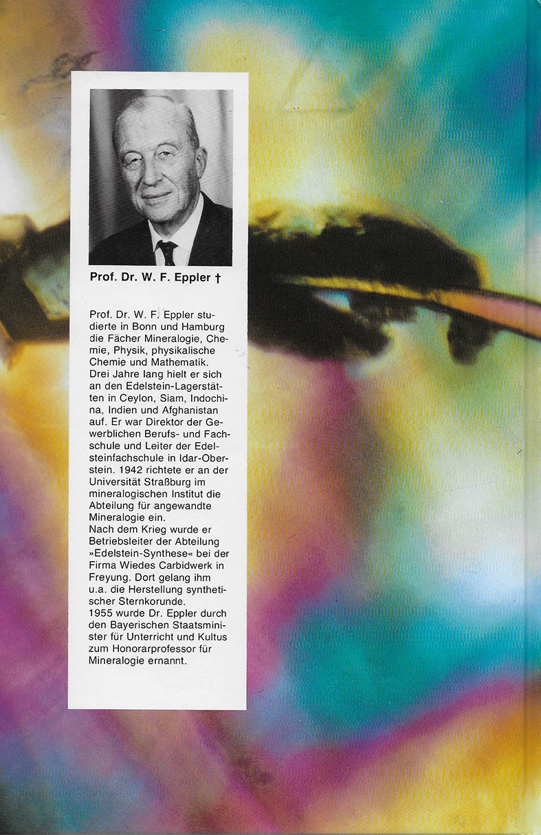 Prof.Dr.W.F.Eppler studierte in Bonn und Hamburg die Fächer Mineralogie, Chemie, Physik, Physikalische Chemie und Mathematik. Drei Jahre lang hielt er sich an den Edelstein-Lagerstäten in Ceylon, Siam, Indochina, Indien und Afghanistan auf. Er war Direktor der Gewerblichen Berufs- und Fachschule und Leiter der Edelsteinfachschule in Idar-Oberstein. 1942 richtete er an der Universität Straßburg im mineralogischen Institut die Abteilung für angewandte Mineralogie ein. Nach dem Krieg wurde er Betriebsleiter der Abteilung >Edelstein-Synthese< bei der Firma Wiedes Carbidwerk in Freyung. Dort gelang ihm u.a. die Herstellung synthetischer Sternkorunde.1955 wurde Dr.Epller durch den Bayerischen Staatsminister für Unterreicht und Kultus zum Honorarprofessor für Mineralogie ernannt.